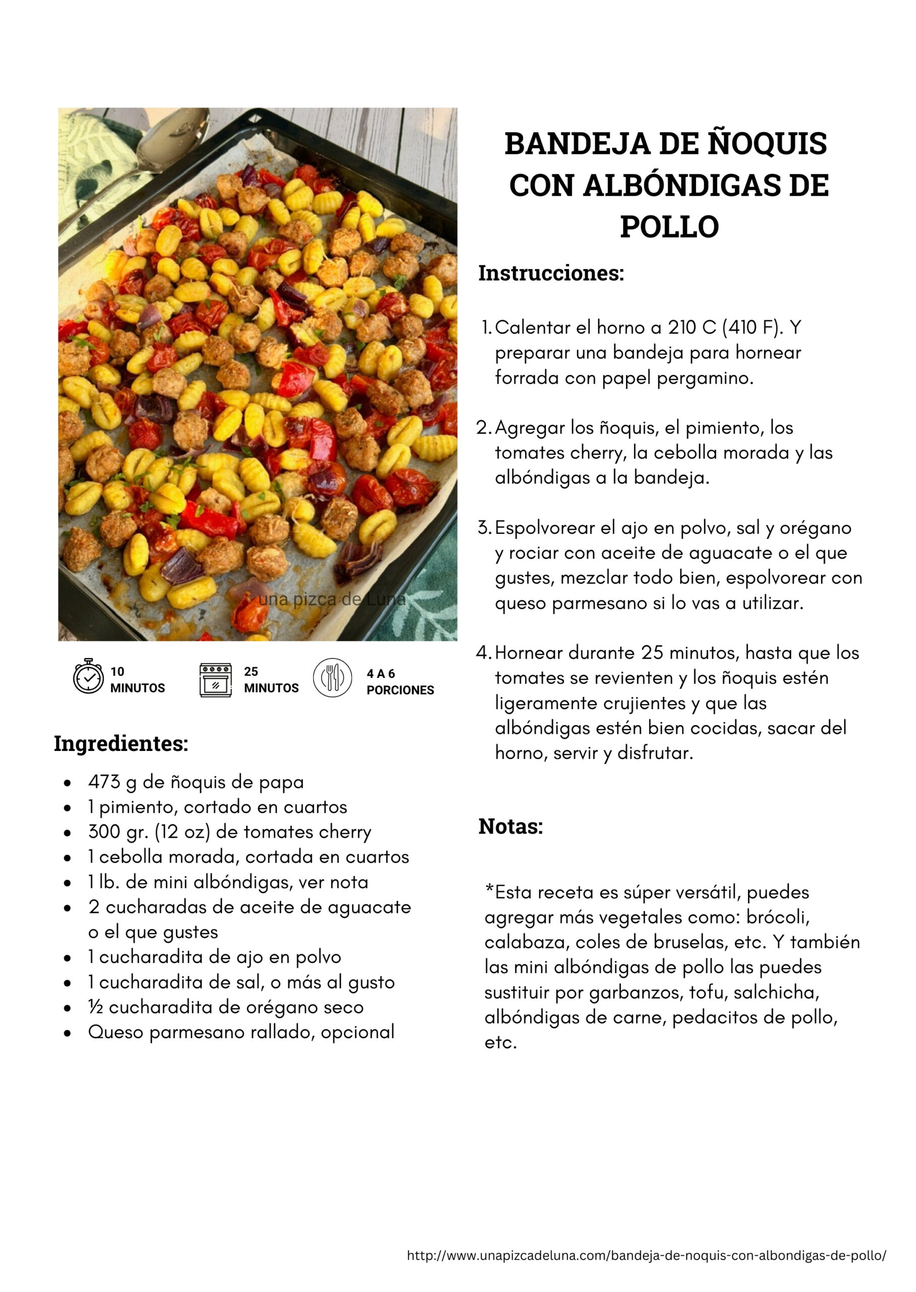 Esta sencilla receta consiste en mezclar los ñoquis crudos, los vegetales y las mini albóndigas de pollo en una bandeja para hornear. Luego, se sazona con aceite, ajo en polvo, sal y orégano. Finalmente, se hornea todo junto hasta que los ñoquis estén crujientes y los demás ingredientes bien cocidos, listo para servir.